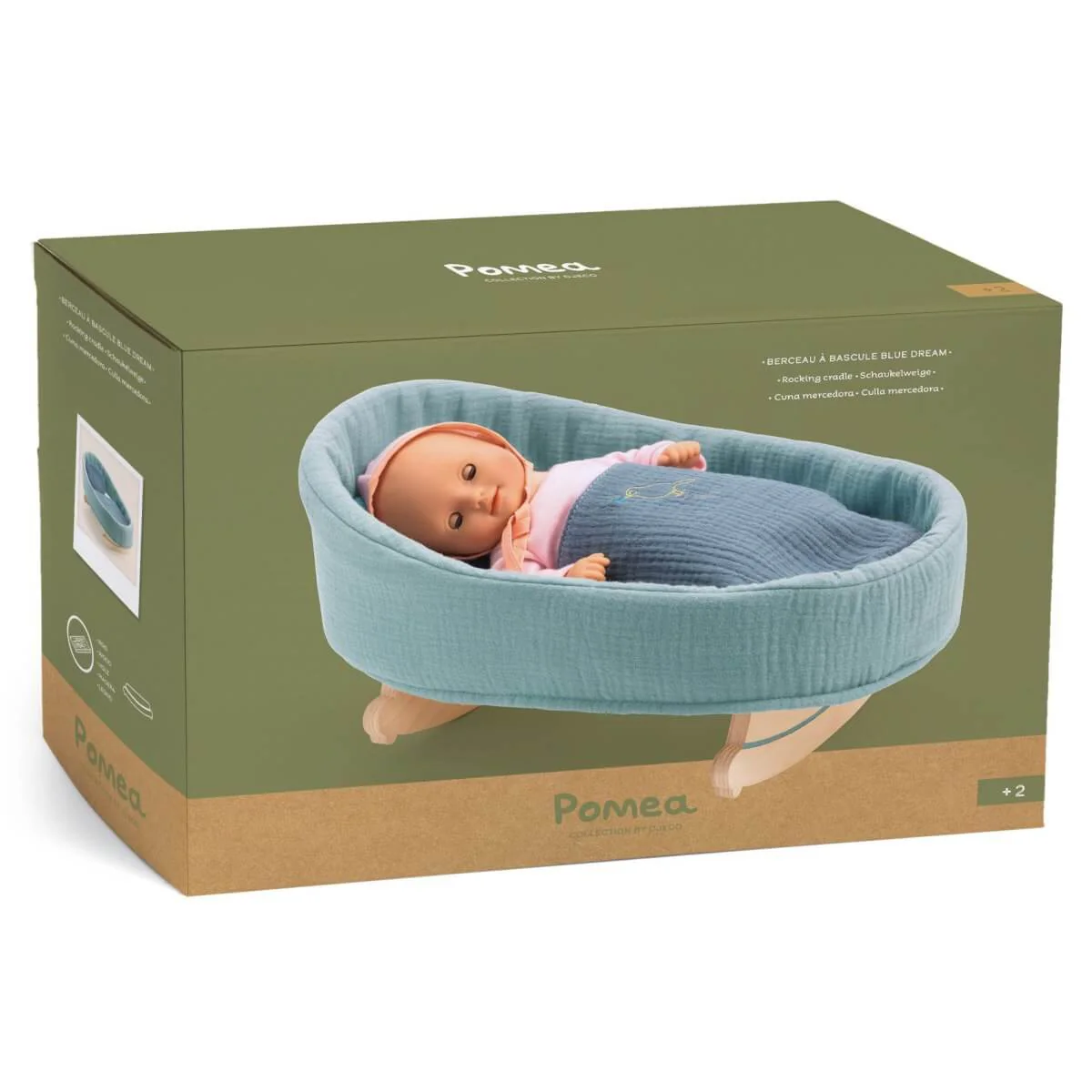 Un berceau à bascule recouvert d’une housse bleue matelassée en double gaze 100% coton. Avec l’oreiller et sa couverture moelleuse, le poupon sera confortablement couché pour s’endormir paisiblement, bercé par ses petits parents. Lit à bascule en bois de la collection Pomea. Adapté aux poupées bébé de 30 à 36 cm. Inclus couverture et oreiller […]