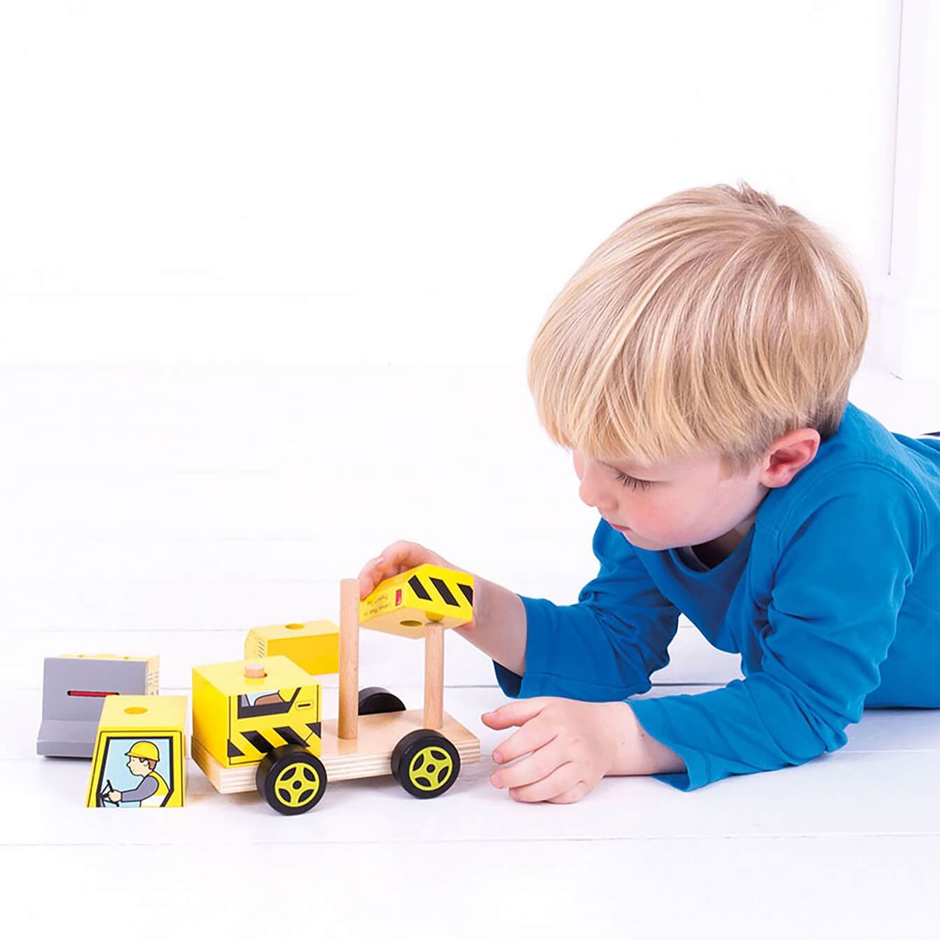Voici le Bulldozer à empiler de Bigjigs Toys ! Le jouet à empiler en bois jaune vif est peint avec des motifs de style construction et comporte son propre conducteur de bulldozer.