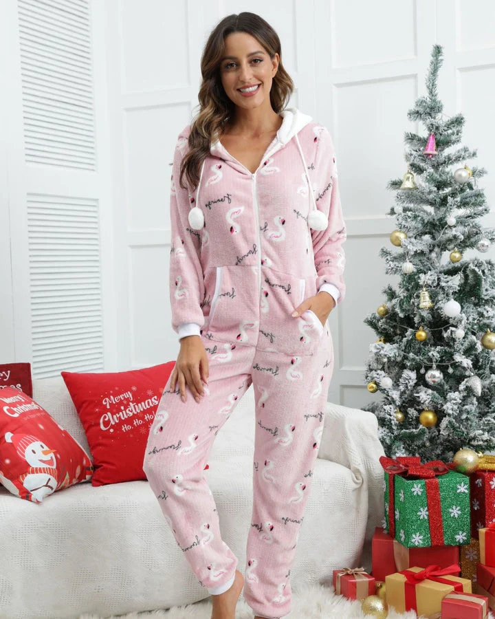 Niveau design : du rose et encore du rose ! Si vous avez toujours rêvé d’une combinaison Pilou Pilou femme à motif, sachez que vous ne trouverez pas mieux que cette grenouillère polaire rose, elle vous accompagnera tout au long de la nuit et vous permettra de rester belle et élégante peu importe le moment de la journée. Deux pompons au niveau du col ainsi qu’une capuche chaude afin de protéger vos oreilles du froid, enfin, une fermeture éclair zippée afin d’ouvrir et de fermer ce vêtement homewear en toute simplicité.