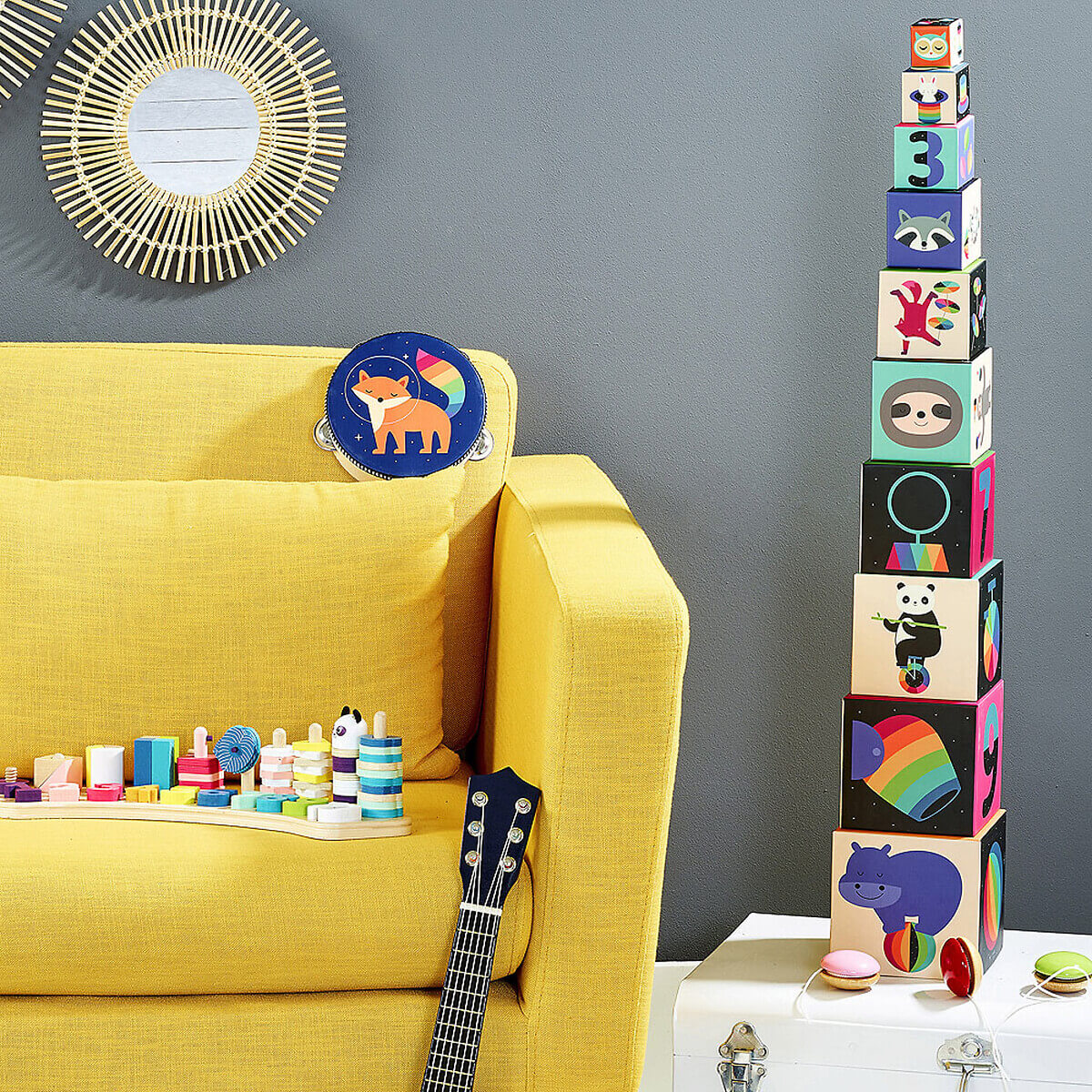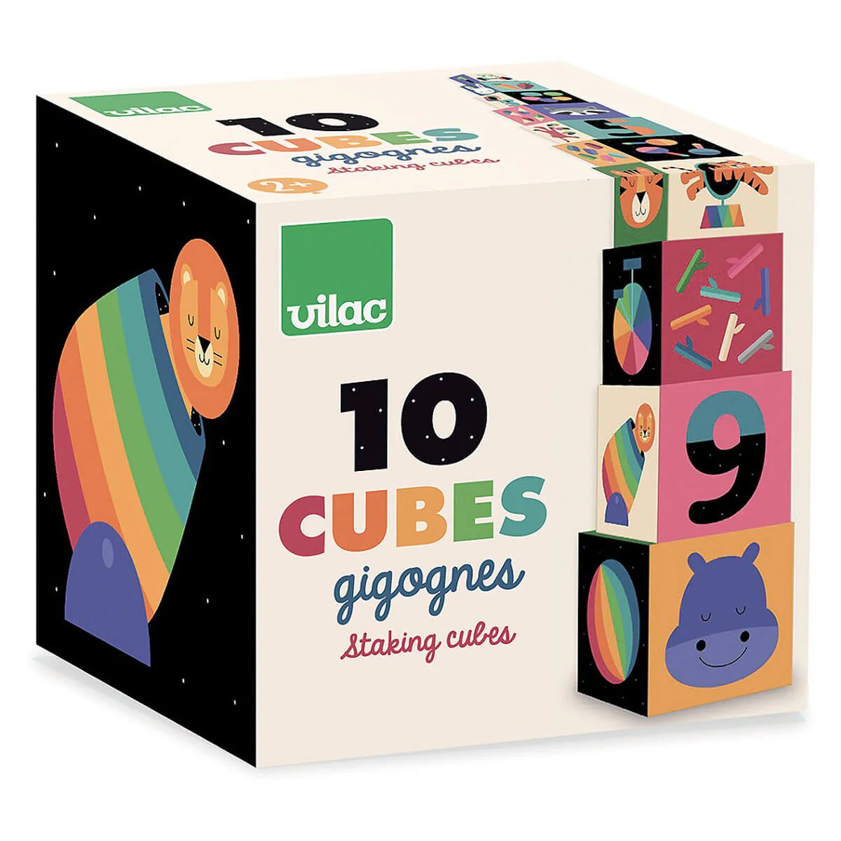 Vilac a conçu ce set de 10 cubes en carton rigide, illustrés avec une palette arc-en-ciel pleine de poésie par l’artiste Andy Westface.