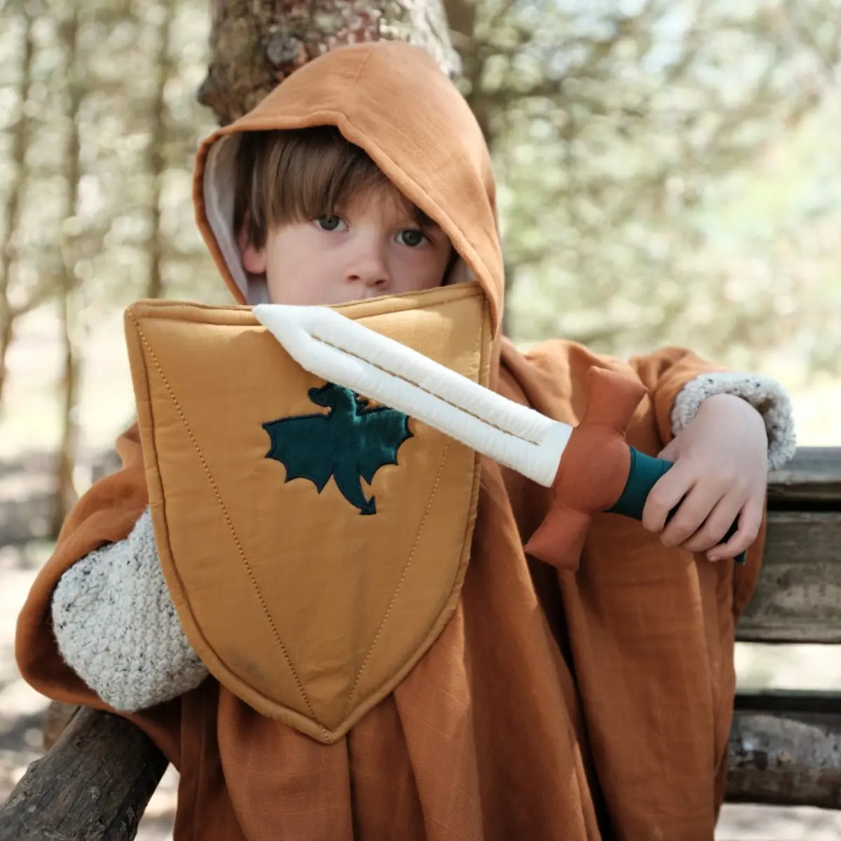 Les dragons volent et de merveilleuses aventures les attendent. Ils partent combattre le bien contre le mal dans la forêt enchantée ! Bouclier : 30×25 cm / Hauteur de l’épée : 25,5 cm 100% coton biologique Garniture en polyester recyclé Voir tout Fabelab Voir tout Déguisements