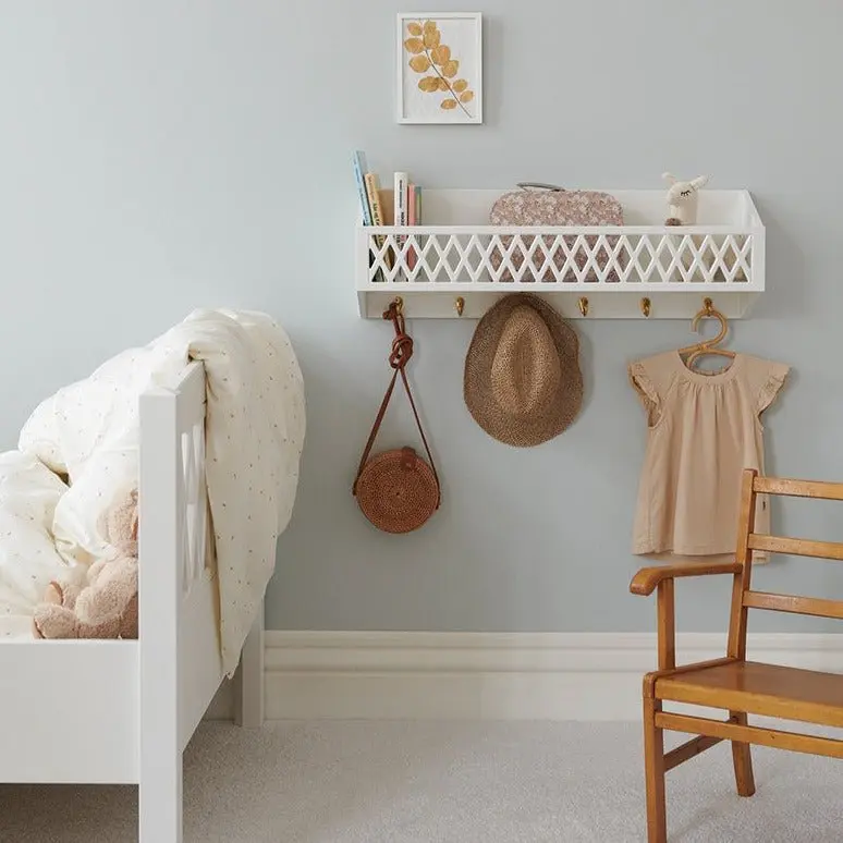 Donnez à votre chambre d’enfant un air fantaisiste avec l’étagère Harlequin aux crochets en laiton blanc ! Sa forme unique et ses crochets en laiton donneront à chaque pièce un style unique et charmant. Le must-have pour les fans de design et de Cam Cam !