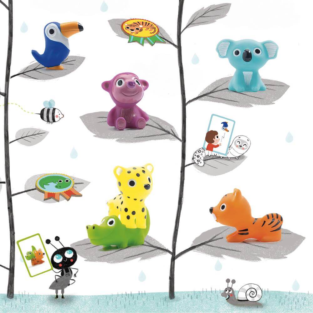 - 7 animaux de la jungle: tigre, girafe, crocodile, singe, léopard, toucan, lion.