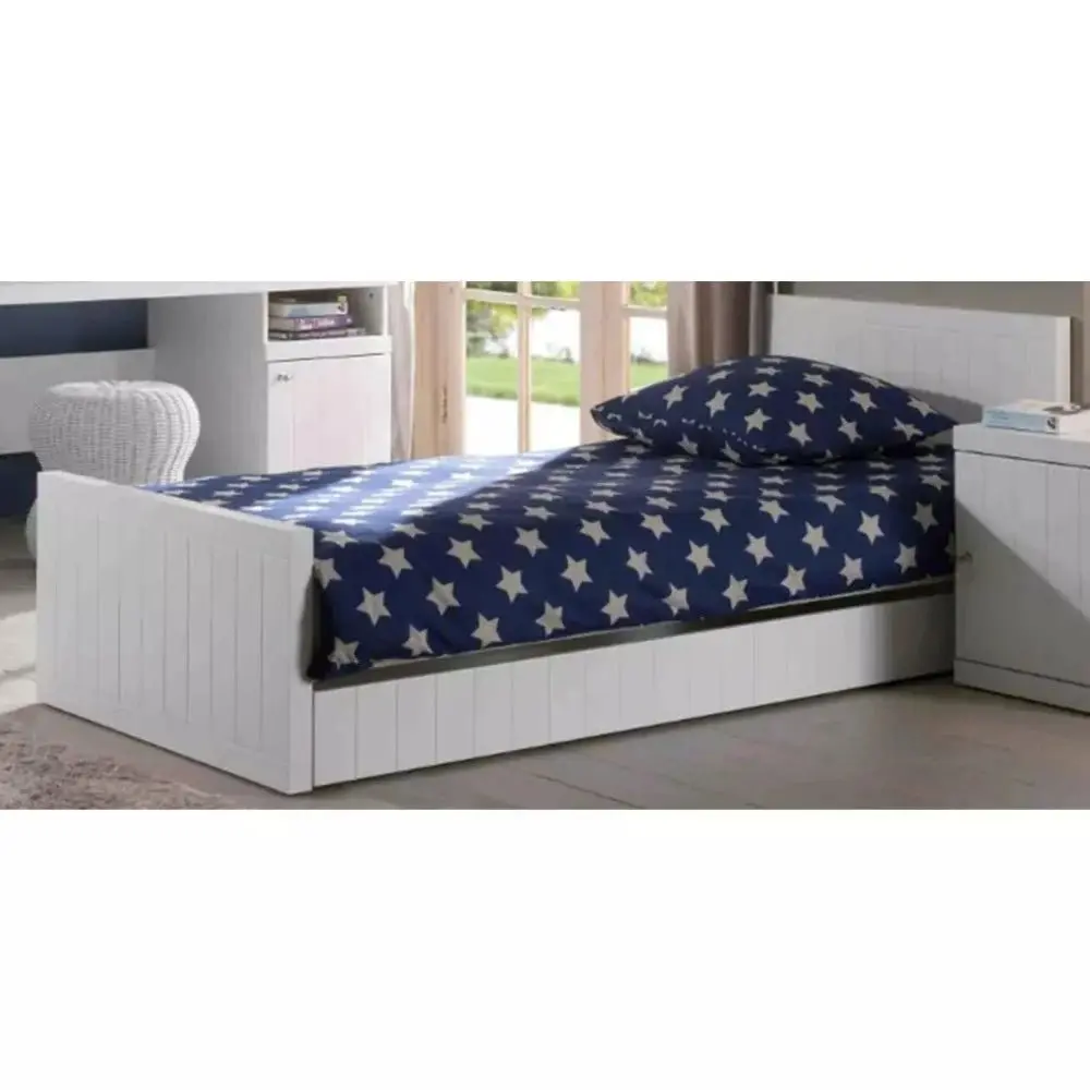 Ce lit ROBIN est fabriqué en MDF laqué blanc combiné à du pin massif. Le sommier à lattes est inclus et convient à un matelas de 90×200 cm. Le lit est fini avec de fines rainures verticales à la tête et au pied du lit.