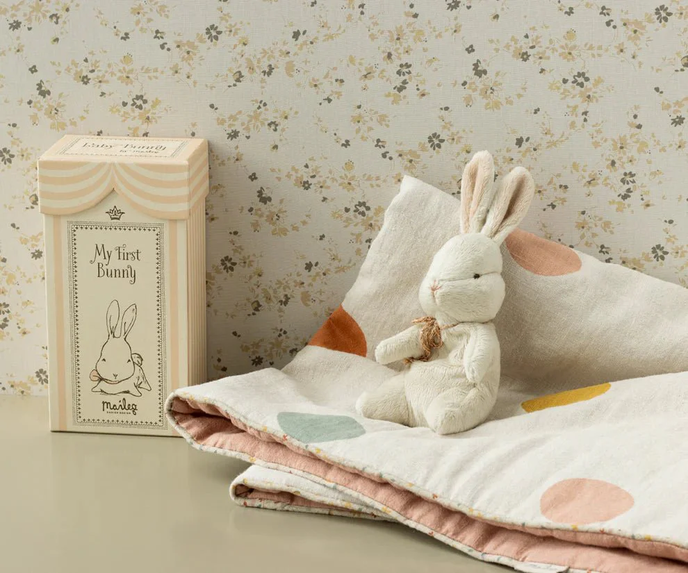 Mon Premier Lapin en Blanc Cassé de Maileg, et le cadeau idéal pour une naissance, un compagnon de vie, collection 2025. Ce charmant lapin, avec sa texture ultra douce et son ruban coloré, est spécialement conçu pour stimuler l’imagination des plus petits et favoriser les liens affectifs. Parfait pour les petites mains, ce lapin est fabriqué avec le plus grand soin pour devenir rapidement le meilleur ami de votre enfant.