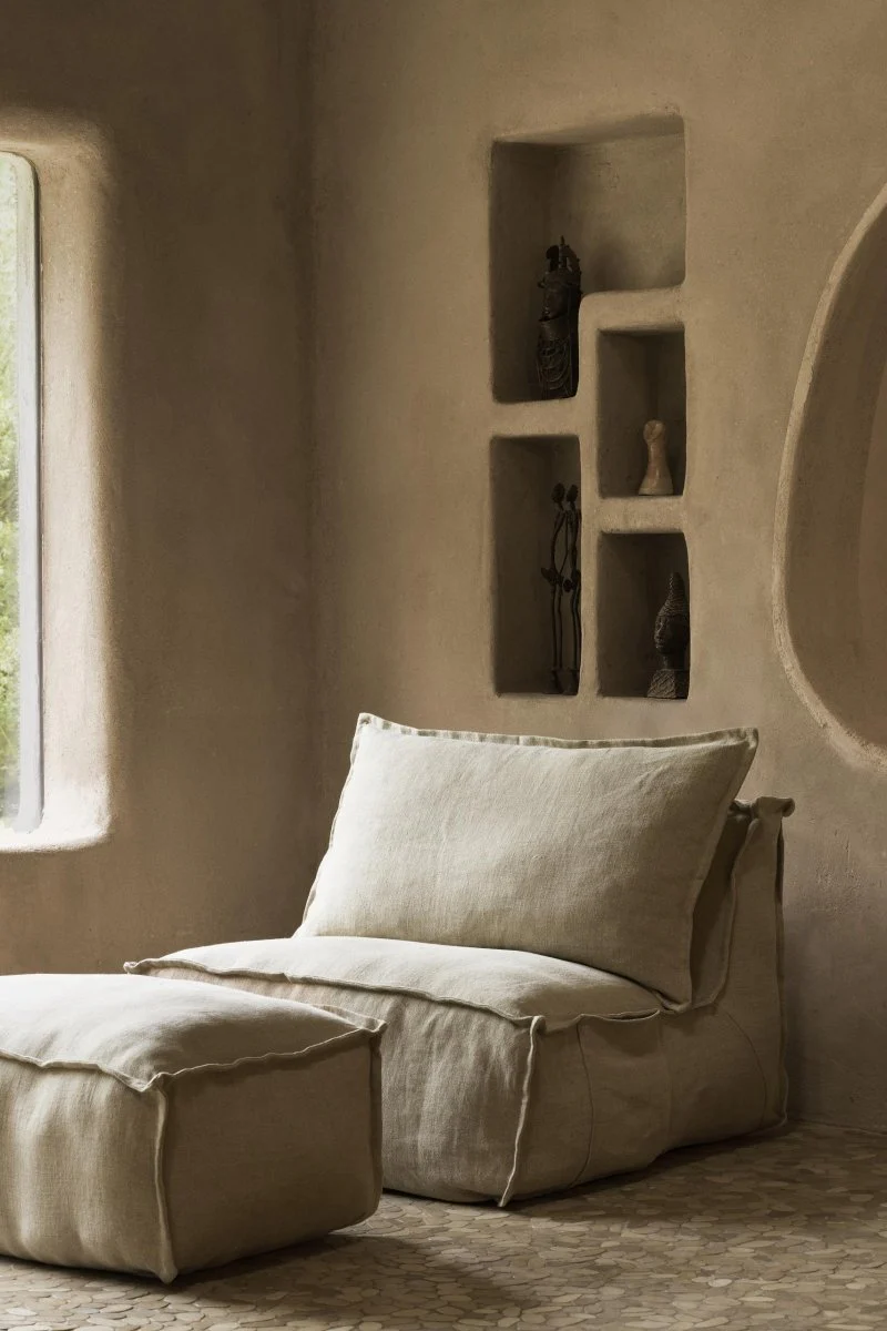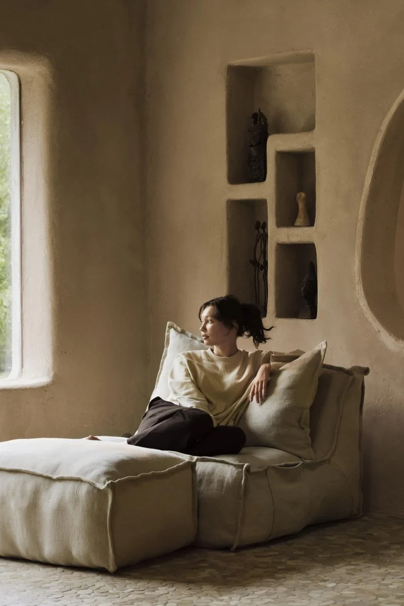 Le pouf en lin est le complément idéal du fauteuil en lin. Revêtu du même lin doux et respirant et doté de lignes organiques et apaisantes, il offre un confort supplémentaire pour vos jambes ou peut servir de meuble d’appoint polyvalent.