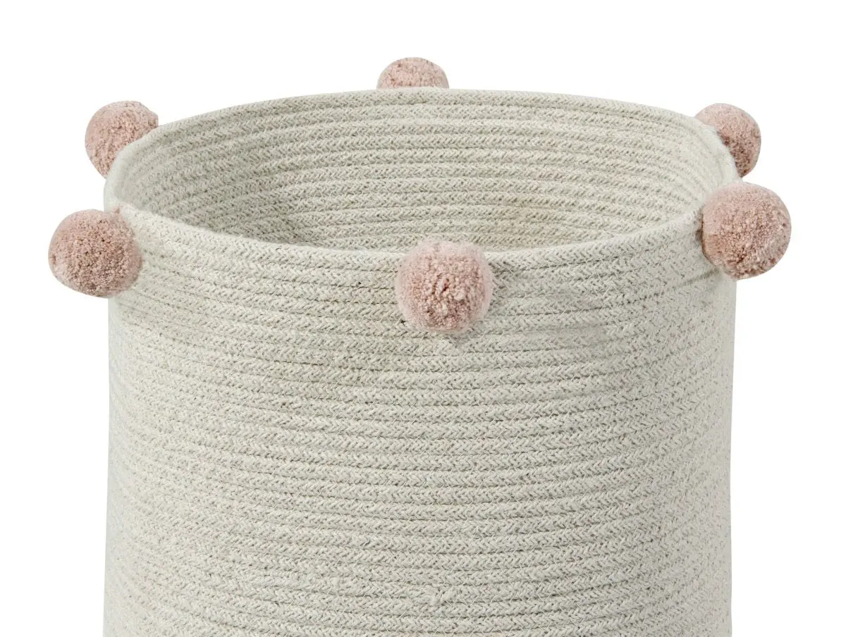 - Les paniers Bubbly sont parfaits pour ranger des jouets ou des livres et sont aussi un élément décoratif très actuel dans le salon, la salle à manger ou dans une autre pièce de la maison. Panier en coton tressé avec base circulaire, en couleur naturelle et boules de coton nues sur le dessus du panier.