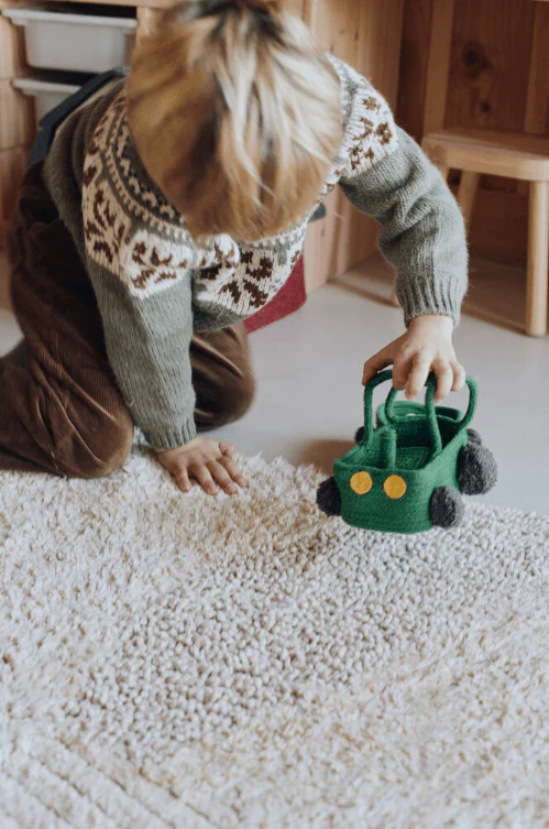 Montez à bord du tracteur et préparez-vous à transporter tous vos petits jouets ! Ce superbe panier de rangements est conçu avec des cordes de coton vertes et se distingue par ses nombreux détails charmants : des lumières décoratives, huit pompons ronds représentant des pneus, et une plaque d’immatriculation personnalisée marquée « L0R3NA ».