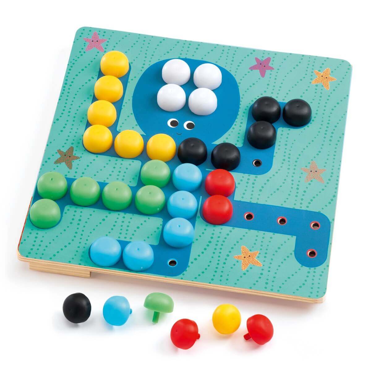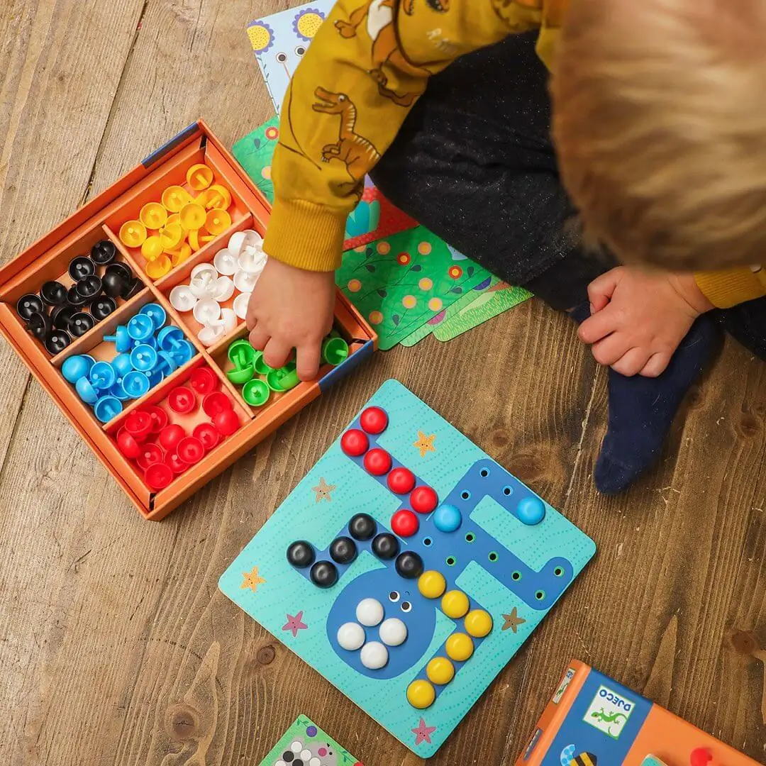 Découvrez le jeu Primo Mosaïco de Djeco, un jeu de mosaïque éducatif pour les enfants dès 3 ans. Votre enfant va devoir placer les picots sur les images, afin de créer les animaux en mosaïque.