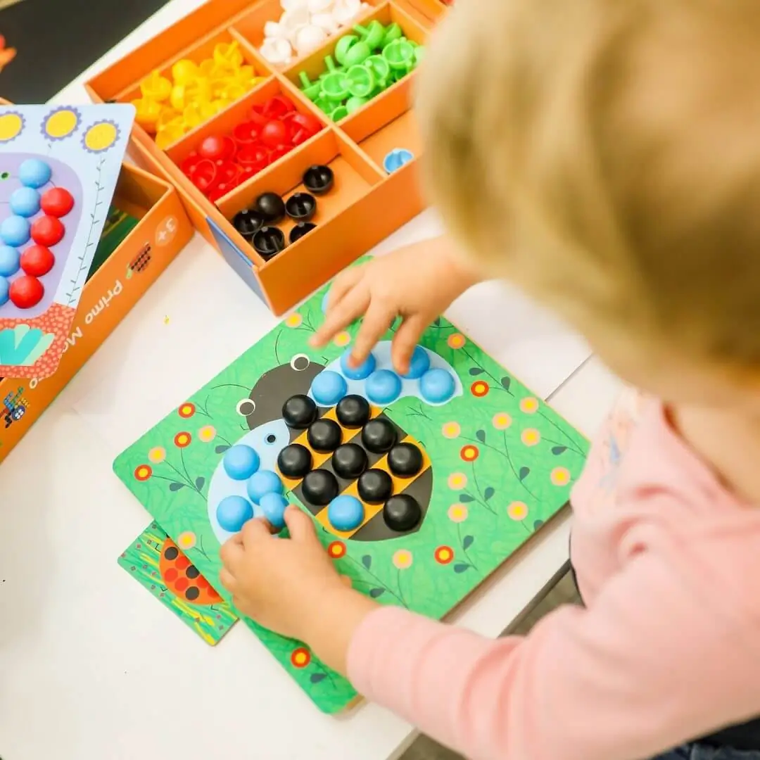 Primo Mosaïco est un jeu ludique, facile à manipuler, parfait pour apprendre les couleurs. Un escargot, un oiseau, une abeille, une coccinelle… vont prendre des couleurs grâce à votre enfant.